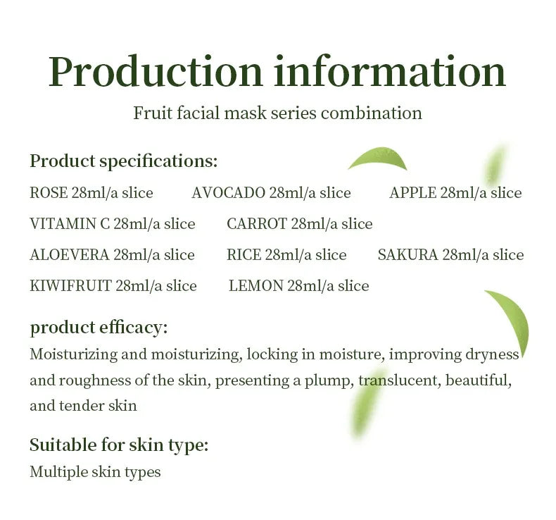 This fruit-flavored mask is specially designed for hydrating, moisturizing and moisturizing, combines a variety of natural plant essence and protein ingredients, gently and effectively brightens skin tone, and is suitable for all kinds of skin.